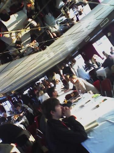 Ahogy hirtelenjében körülnéztem a fedélzeten, Iancu Laurát véltem felismerni egy széprókalány arcú költőnőben, éppen buzgón dedikált. A sok-sok látásból ismert arc között a Dokk Irodalmi Kikötő jelenlegi és ex-szerkesztői is a szemembe tűntek. Ijjas Tamás ugyanúgy néz ki, mint idáig minden alkalommal, s mindig ugyanolyan (jó) kedélyű. Most - mint mondta - új gyermekverskötetet. Simon Márton nem mondott semmit, csak köszönt - ő viszont mintha állandóan magasabb lenne, minden találkozásunk alkalmával (vagy én leszek egyre kisebb). Tolvaj Zoltánnak tavaly óta hidalgó szakálla nőtt. Tavaly előtt még úgy nézett ki, mint egy gályarab, "derékig érő" hajjal. Aztán megjelent az első kötete és fegyenc-kopasz lett. Most meg hidalgó - aki mégis spórol. (Magával hozott dobozos söreit ajánlgatta, mert a fedélzeti kantin drága.)