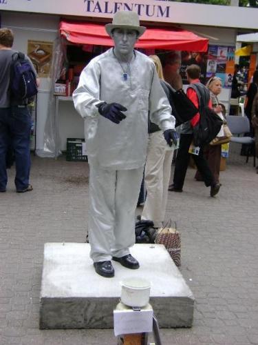 Egy mozdulatlan „élőszobor” bolondozott a Talentum kiadó előtt. Mivel a fotózás után egyértelmű kézjele ellenére sem adtam pénzt neki, kukorékolt néhányat, majd kétszáz forintért meg akarta venni a digitális felvételt. Hogy mi lett a pénz sorsa, megtudhatják a következő cikkből.