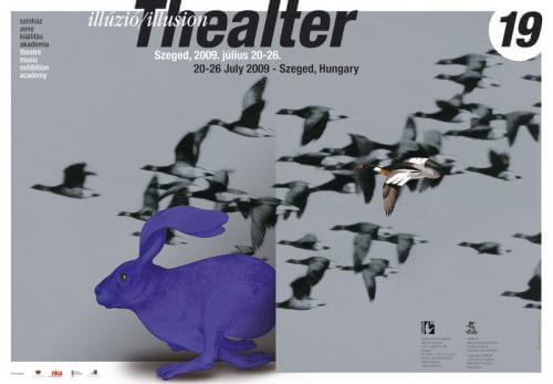 Keresd és kövesd a kék nyulat, és rátalálsz a 19. szegedi Thealter helyszíneire! – mondhatná a vizualitást kiegészítő reklámszlogen, de a fesztivál hagyományaiból sejthető, hogy nagyon kevés lesz az ilyen didaktikusan kimondott frázis. Ha pedig lesz is, talán csak annak az illúziónak az eszközeként, amely a rendezvény kulcsszavaként tematikusan összeköti az egyes előadásokat, és amelyet Balog József is hangsúlyozott a Szabad Színházak Nemzetközi Találkozóját megnyitó beszédében. Talán tavalyi cilinderéből került elő a nyúl, amely most színes fejfedővé (kapedlivé?) változva – és ezzel sajátos formában megadva a tiszteletet a Régi Zsinagógának – már nem nyújthatott menedéked a különös szimbólumnak. És talán van is alapja a menedék szónak, mert a vonuló madárhad a Nils Hollgersontól Hitchcockig terjedő allúziókat kelthet. És talán a Thealter végére mindenki megtalálhatja illúziók között a sajátját, amely közelebb áll Nils Holgersonhoz, mint a művi vagy bármilyen formájú rémülethez.