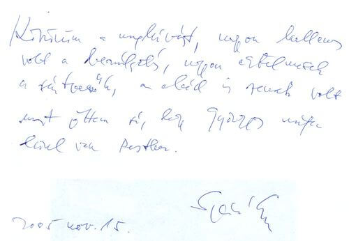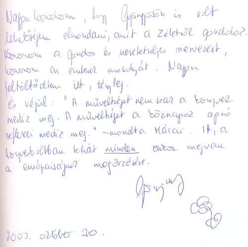 Závada Pál vendégkönyvünkbe írt szavait kölcsön véve, kedves vendéglátásunkkal és érdeklődő szeretetünkkel nagyon sok szellemi örömöt szeretnénk még szerezni az igényes gyöngyösi közönségnek.
