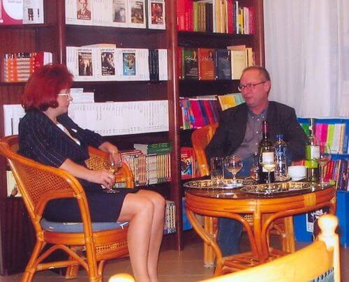 részében kialakított helyszínen tartottuk, ahol először boltvezetőként én beszélgettem vendégünkkel, majd az érdeklődők tehettek fel kérdéseket, illetve a szerző dedikálta műveit. Az elmúlt hónapokban beszélgetőpartnerem volt többek között: Alföldi Róbert, Görög Ibolya, Csernus Imre dr., Grecsó Krisztián, Moldova György, Parti Nagy Lajos, Banga Ferenc, Spiró György, Schäffer Erzsébet, Tolvaly Ferenc és Závada Pál.