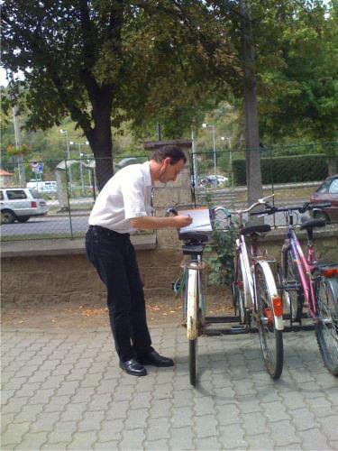 Irodalom- és biciklitörténeti pillanat: Nyilas Atilla dedikálja Álmoskönyvét.