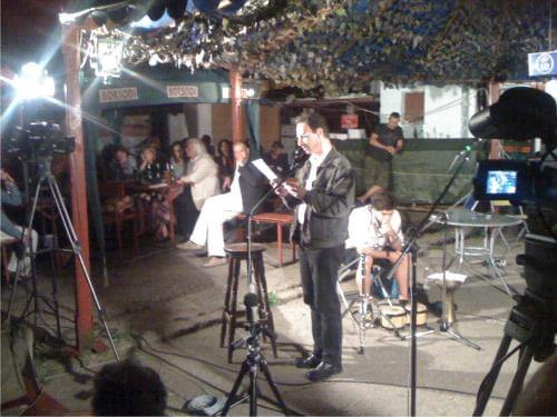 Vass Tibor, a Spanyolnátha főszerkesztője olvas. Mellette Turczi István a Parnasszus főszerkesztője.