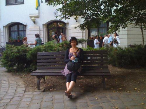 Iancu Laura, aki nyelvőrzés munkacsoportokat vezette, s akinek gyönyörű verseiből, már az Irodalmi Jelen is közölt, üldögél egy padon, s ásványvízzel szomját oltja.