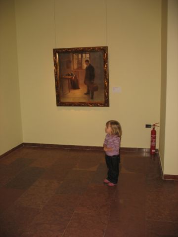 Nekem azóta, hogy édesapa egyszer föltolt babakocsival Buda várába, s mivel a tőle megszokott hebehurgyasággal, rögtönözve egy vas nélkül indultunk el, még egy csokit sem tudott nekem venni, hát megnéztük Borsos József kiállítását (a Nemzetőr festője, fotográfus is), ahol, én a besötétített teremben féltem egy kissé, de a várba vágytam vissza. És ma vasárnap édesanya is úgy gondolta, hogy a müncheniek kiállítását, mármint a Nagybányát megelőző és azt inspiráló Müncheni Iskola képviselőit meg kellene nézni. Nekem ez nem sokat mondott, de a vár vonzott. Most lifteztünk, az Attila út felől, és rá kellett jönnünk, hogy a kiállítás nem Savoyai Jenő lovának a feneke mögött van (ahogy apa szokta mondani), hanem a másik szárnyban van, a Ludwig múzeum hűlt helyén. Nagyon kedvesen fogadtak minket, volt kicsike játszószoba, benne babzsákokkal és játékokkal, így édesapa ott hagyott minket Anyával, s ő végigrohanta az egészet, amíg mi játszottunk. Aztán velünk is sokkal részletesebben. A földszinti rajzoktól, amik fekete fehérek zömmel, még féltem, de a képektől nem. Egy aktra mondtam is apának, hogy a néni nem vett föl pizsamát, ezért meztelen, de hogy miért mosolyogtak a felnőttek ezen, azt alig értem. A rengeteg kép közül engem végülis a pihenő székek nyertek meg, mindre fölkapaszkodtam és ráfeküdtem. Édesanya és édesapa egyetértettek, hogy ezt a nagy válogatást még egyszer meg kell nézni.