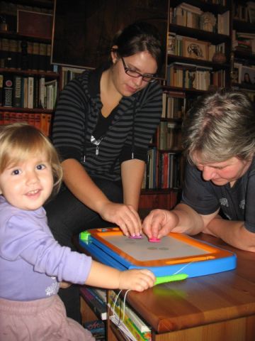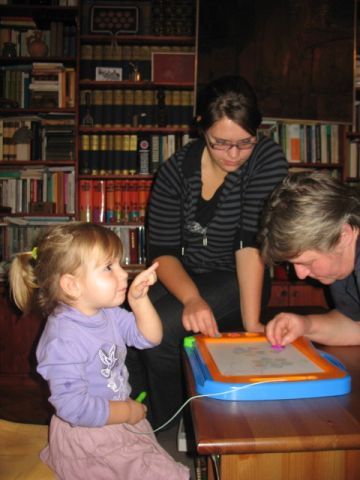 Pénteken este végre nem mi voltunk Konkoly Kingáéknál Veresegyházán, hanem ők nálunk. Itt találkoztak először Tünde doktor néniével és Túri Pisti bácsival meg a leányaikkal, Zsebivel és Judittal. Tetszettek egymásnak, bár ezt mi Kingával alig láttuk, mert körbe-körbe rohangáltunk a lakásban, amíg bírtuk. Hát utána nehéz volt engem ágyba terelni, volt nagy hiszti, meg sírás-rívás, mentem volna velük és maradtam volna itthon is. Szombaton viszont édesapa unokatestvére, az építész Antal Jenő bácsiék voltak Tari Zsuzsival és Zsófi, illetve Peti gyerekükkel. No, a mágneses rajzasztalom előtt Zsófi és Zsuzsi látható, Péter meg Jenő bácsi a nagy asztalnál, és poharaznak, abból az illatos sárgából, ami bor. Viszont édesanya fatörzset sütött és Kingáék hoztak egy tündéri csoki-tortát, úgyhogy volt gyertya megint. Volt köszöntés ismét. Nem is tudom, hogy meddig tart ez a születésnaposdi, egész évben? Mindenestre én élvezem.