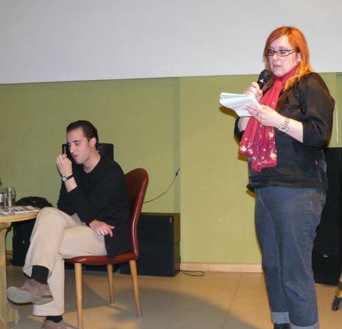 Végre elkezdődik a beszélgetés. Jó lenne két mikrofon meg forgatókönyv, úgy sem ide-oda adogatni, sem lapozgatni nem kellene a feszült csöndben.