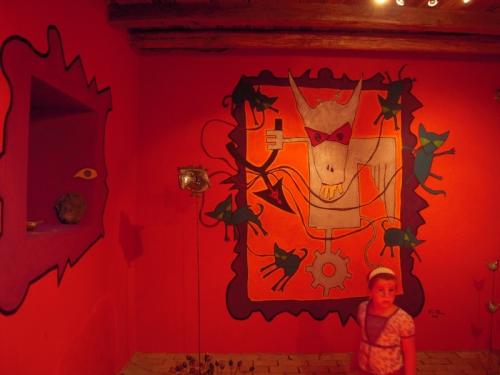 A koncert után ugyanott Másik János idézett meg régi Kex-slágereket, és dünnyögött harmonikás-bús-bordalokat, ám sajnos nem hallottuk végig, hiszen a nagyharsányi tornateremben kezdődött a Bárka Színház Pirandello-játéka. Merengőn érkezünk meg a kerítéshez, de egy szobából kiszűrődő lila fénynyaláb elhúzott onnan. Kiss Tibi és Háy János ördög-angyalszobájára leltem. Az alkotók idén pingálták ki a falakat és az infernális tapétázást csak Háy félszeg angyalai ellensúlyozzák valamelyest. Láttán, mindenesetre feszültség terem. És ez a feszültség el sem ereszt, egészen a darab végéig.