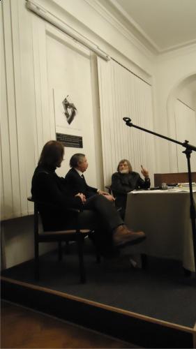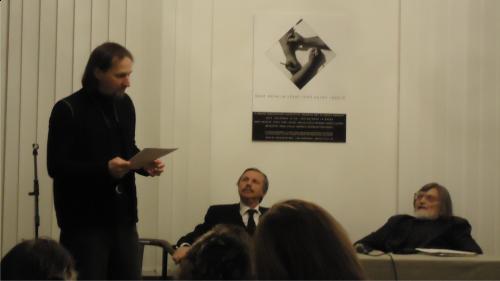 Zsille Gábor felolvas a “könyvtárosról”. Nem tudom, hogyan lehet szépen megemlékezni egy alkotóról. Nem tudom, hogyan lehet “megidézni” a szellemét. De az biztos, hogy a műveivel szinte óhatatlanul elénk tűnik az alakja, és maivá válnak a gondolatai. Zsille Gábor felolvasását jó hallgatni. Van benne valami közösség-érzet és valamiféle játékos tisztelet is. Érezhetően érti és érzi Hamvas Béla sorait. Az est három pontján történik meg ez az “utaztató” mozzanat, amiben az irodalom és a szellem még a terem fűtetlen huzatosságát is feledtetni tudja. De. Ha lehetne csak kérdőmondatokkal írni egy cikket, akkor, azt hiszem, örömmel illeszteném a kacskaringózó írásjeleket a következő mondataim végére. Mégis (olykor) megpróbálkozom a pontokkal. Igazából nem tudom, van-e olyan, hogy az “est moderator” kézikönyv. Amolyan íratlan formula. Igazából nem is hiszem, hogy kellene lennie.