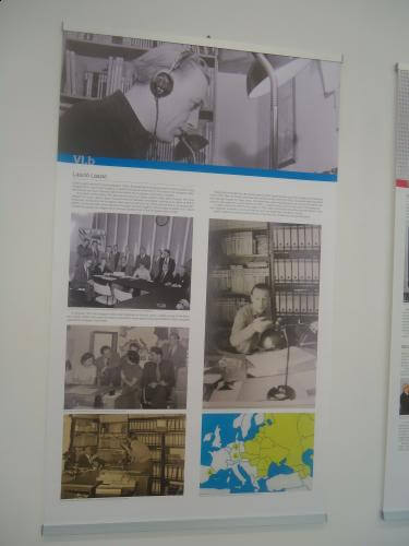 tevékenységét, különösen az irodalmi kapcsolatokat, például Borbándi Gyuláét, aki Gyulai Ernő néven lett a Szabad Európa munkatársa, és a Magyar Osztály helyettes igazgatója volt; vagy Lángh Júliáét, aki a Rádió párizsi tudósítójaként dolgozott, majd 1984-től a rádió megszüntetéséig müncheni szerkesztője volt. De az egész nyugati magyar emigráció is rengeteg szállal kapcsolódik a Szabad Európa tevékenységéhez, ahogy azt épp a Borbándi Gyula szerkesztette lexikon bizonyítja számos adattal. Jelen kiállítás az itthon kevésbé ismert László Lászlónak szentel egy plakátot, aki 1929-ben született Budapesten, majd a kommunista rezsim elől Ausztriába menekülve csatlakozott a Magyar Menekültek Szövetségéhez. A Szabad Európa 1951-ben kínált fel a számára szerkesztői állást. Negyven éven át volt a rádió munkatársa, és a plakát tanúsága szerint fontos szerepet játszott a magyar szerkesztőségben. Jelenleg Münchenben él.