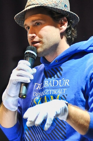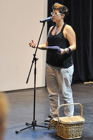 A következő előadó, T. G. mind a hangjával, mind a mozgásával beleadott apait-anyait: hol keményen rappelt, hol énekelt, hol tombolt: ahogy egy randin is megeshet, a jéghidegtől a tűzforróig vitte az érzelmeket. Őt látva-hallgatva leszűrhettük: a drámaiság sem áll távol ettől a műfajtól, ihletettebb pillanatokban, bizony, összeszorul a hallgatóság torka. A T. G. után színre lépő Bárdos Deák Ágnes gyorsan visszautasította a „költő” megnevezést, amely őt hidegen hagyja, inkább dalköltőnek nevezi magát. Ezt ki is egészíthetjük: Bárdos-Deák a maga műfajában a legjobb dalköltő. Most is „ágisan” elropta-dallta a szövegét, amelyben a társkereső oldalak bárgyú jótanácsait gyúrta verssé, és szólaltatta meg a villámrandi-tanácsadók jól megénekelhető ostobaságait.