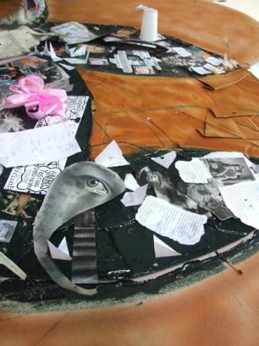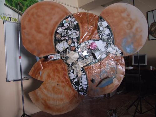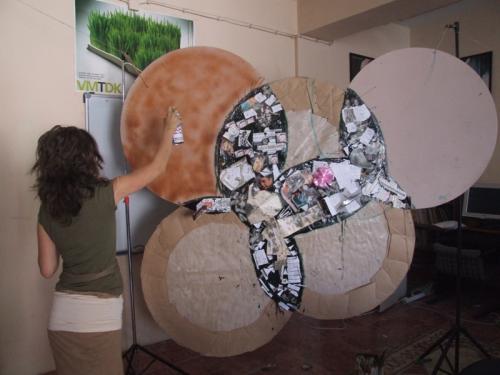 És már dolgozunk is keményen – főképp Erna. Készül a gigászi kollázs. (Természetesen – némi utósminkeléssel, tréfás kiegészítéssel – a sörlista is felkerül rá!) Samu János Vilmos barátom a későbbiekben persze roppant tudományos magyarázatot kanyarít melléje, kérem tisztelettel: egy multidimenzionális objektumot hoztunk mi itt létre seperc alatt! Nem árt ez a körítés másnap a média képviselői előtt, performansszá lényegül a lépcsőházi felolvasásom is, miközben a közönségünket visszavezetjük a kultúr-recycle origójához – a kukához. Közben csudára élvezem, ahogyan Bencsik Orsi huncutul erotikus sorai hangzanak fel mély férfitorkomból.