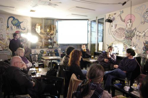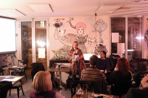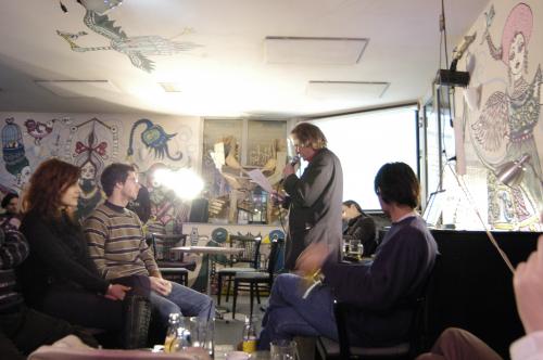 Korányi rögtönzött felolvasásához gyorsan átvette az esten az ókori tekercs-tartók szerepét betöltő laptopot, melyhez egy óriási kivetítő is csatlakozott, de mások is igénybe vették e technikai segédletet verseik előadásához. Az interaktivitás egyébként is egyre meghatározóbb tényező (nem csak) az Irodalmi Jelen életében, s bár tavaly szeptembertől a folyóirat újra megjelenik nyomtatásban is, Weiner Sennyey Tibor épp az interaktív jelleg vitalitását, naprakészségét emelte ki pozitív tényezőként.