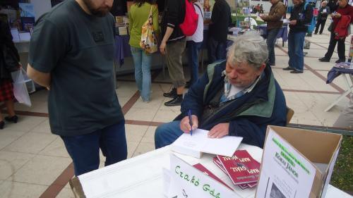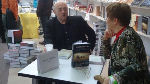 "Szörnyen megosztott ez a világ" – Márton László. Jobb oldalán Csobánka Zsuzsa dedikál