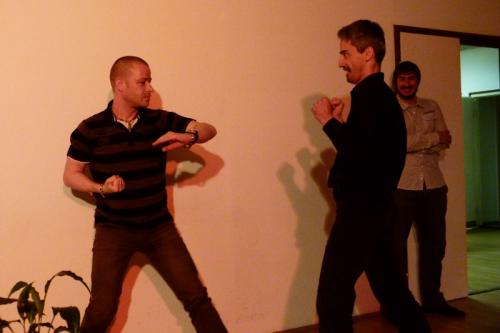 A felolvasások után következett a beígért testi párbaj. OJD hármat üthetett teljes erejéből MSO gyomrába, akinek ettől még a tekintete sem rezdült. Megcsillant a székelyudvarhelyi író-karatemester fekete öv három danja! A harc után Murányi rögtönzött táncprodukciójához a zenét a Bartók Néptáncegyüttes tagjai szolgáltatták. Ezzel azonban még nem ért véget a rendhagyó est. A közönséget néptáncegyüttes szórakoztatta, akiknek köszönhetően könnyen rá lehetett hangolódni a táncházra, mely megfelelő levezetése volt a szokványosnak egyáltalán nem nevezhető irodalmi eseménynek. OJD-MSO SHOW: várjuk a folytatást!