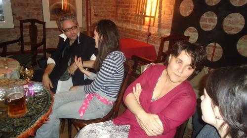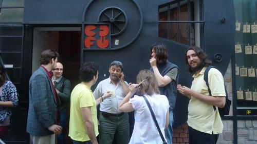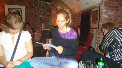 Payer Imi után rögtön szünetet is kell tartani. Így viszont van idő, hogy megcsodáljuk Jakatics-Szabó Veronika és Rónai-Balázs Zoltán frissen elkészült, még nyomdameleg verses-képregényes kötetét, amelyet ők a „Mi Kis Hibridünknek” becéznek. Kántás Balázs is új kötetet dedikál, a Röntgenképet. Belefülelünk egy beszélgetésbe: Szabó Imola Julianna és újonnan létrejött alkotócsoportja, a Hímzőkör másnap tartja bemutatkozó estjét. Többen a könyvheti dedikálásukra invitálnak. Aztán visszaszállingózik a költősereg. Immár teli a pince, az összetolt asztalokon bőven túlterjed a hallgatóság is, barátságosra leheljük be a dohos levegőt. Egyszerre lélegzünk.