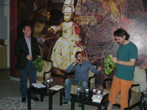 A lenyűgözően tágas belső szolgált a nemes verspárbaj helyszínéül – a tér méreteinek köszönhetően akár lovagi tornát is lehetett volna itt rendezni. Az újraértelmezett-átdizájnolt, freskó méretű reprodukciók alatt találkozott a két küzdő fél: Böszörményi Zoltán és Jónás Tamás. Közös párbajsegédjük, Boldog Zoltán röviden bemutatta a közönségnek az „összecsapó” költőket, hangsúlyozva, hogy alapvetően a versek bocsátkoznak nemes küzdelembe, és nem a személyek. S hogy a viadal erkölcsi alapjaival is tisztában legyen a hallgatóság, Boldog Zoltán idézte Jókai Mór párbajról szóló sorait, melyek az Egy magyar nábob lapjain magyarázzák a küzdelem erényeit: „Egyszóval, mikor a felek nem vérszomjból, nem dühből keresik a párbajt, hanem kénytelenek azt előidézni, hogy szívök erejét, véleményük tartósságát a halál kapuja előtt is bevallják; rendesen ilyenkor szoktak a párbajsegédek pisztolyt adni a vívók kezébe. Azok hidegvérrel fognak eszmélni, mindegyik el van határozva magát kitenni a lövésnek, de ellenfelére nem lőni. A párbaj végződik nemesen, férfiasan. Az illem kívánatainak elég van téve, a sérelmes kérdés eltemettetik, s azt többé előhozni nem szabad.”