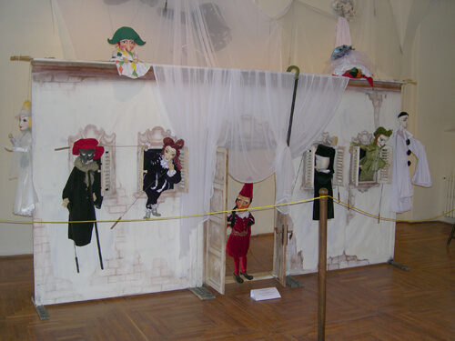 Az Erős János premier és egyben évadzáró előadás díszlete két teremben látható. A magyar tagozat egy tavalyi és idén felújított bemutatója, a Szarvaskirály tárgyi világa szintén jelen van, akárcsak a Mágikus titok és a Világkörüli utazás eszköztára. Változatos díszletelemek, többféleképpen mozgatható, pálcás-és maszkos bábok, marionettek, különféle maszkok és jelmezek szemléltetik a társulat sokféle technikáját. A román társulatét is, amely színes síkbábukkal vitte színre Gellu Naum Apolodor könyve című, egy pingvinkölyök világkörüli útjáról szóló kisregényét. Az idei évad első bemutatóján pedig bunraku típusú bábukkal adták elő a Traian Săvinescu rendezte Aladin és a csodalámpa című darabot.