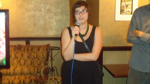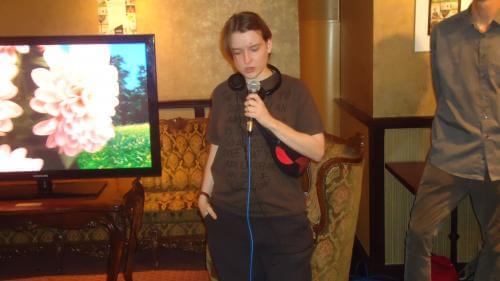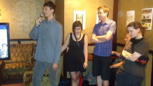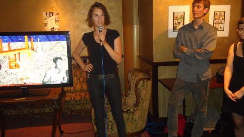 Vincze Nóra saját filmes munkáival rokonította kiállított rajzait, amelyek valóban egy-egy filmkockára emlékeztetik a nézőt-olvasót: az általa kiválasztott egyperces a képek mellett, önállóan olvasható. Remsei-Kovács Nóra inkább comic-stripnek nevezné a képeit, melyeken három nagy „dobozban” egymás mellé helyezte el a rajzokat, a klasszikus szövegbuborékokkal: bennük Örkény csattanós mondatai. Végül Popella Dóra mutatkozott be, aki a tévéképernyőn futó képsorokat alkotta meg Örkény Arról, hogy mi a groteszk? című műve alapján. Dóra egy digitális technika segítségével kétdimenziós fotókat helyezett egymás elé-mögé úgy, hogy az eredmény háromdimenziós képnek látszik. Így láthattuk például három dimenzióban azt a mulatságos jelenetet, „amint a sírásók két vastag kötélen fölbocsátják a koporsót”. A kisfilm egyébként négy másik videoval kiegészülve a Szatyor bárban látható majd.