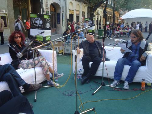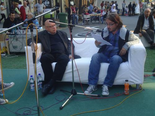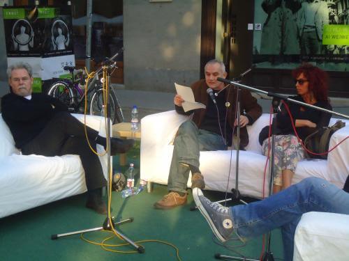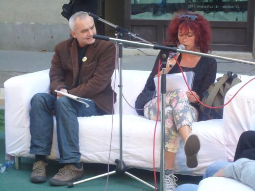 Cserna-Szabó András olvas fel, mellette Fráter Zoltán, a műsor moderátora