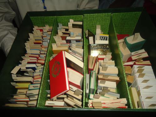 A könyvtár alatt három raktár található, ám a 860 ezer kötetből több mint 700 ezret egy törökbálinti raktárban őriznek, olvasói kérésre azonban másnapra megérkeznek a könyvek a KSH-ba. Mi az úgynevezett tömörraktárat látogattuk meg: ez az a jellegzetes, páncélteremhez hasonló helyiség, hatalmas kormánykerekekkel gurítható polcsorokkal, amilyet a tudósítói szem korábban csak filmekben látott (tipikus krimijelenet!) Az egyik kormánykerék elforgatásával és a könyves „szezám” feltárulásával itt a „legbájosabb” látványosság a minikönyvek gyűjteménye volt – ilyesmi mindannyiunk kezébe kerülhetett, például, a Sokadik Pártkongresszus anyagaként, vörös kötésben. E kis jelzettel, raktári számmal ugyanúgy ellátott apróságok között találtunk angol–orosz szótárat, régi folyóirat szemléjét vagy a Magyar Rádió 25 éves fennállására kiadott, rádióműszergyári történetet.