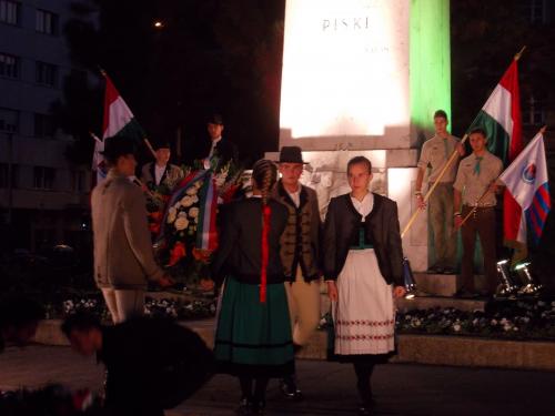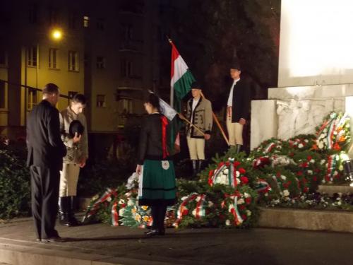 A beszédek, valamint Kodály Köszöntő című kórusműve után kezdetét vette a koszorúzás. Orbán Viktor miniszterelnök nevében főtanácsadója, Szőcs Géza helyezett el koszorút, majd számos hazai és határon túli állami és civil szervezet, intézmény, középiskola, egyetem és diákegyesület képviselői következtek, közöttük természetesen a Rákóczi Szövetség elnöke, Halzl József is. Az ünneplők a Szózattal búcsúztak a tértől, és a még égő fáklyák fénye lassacskán szétszóródott, majd beleolvadt a Duna-parti kivilágításba.