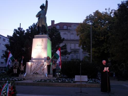 Miután a kórus előadta Berzsenyi A magyarokhoz című művének Kodály-féle kórusfeldolgozását, Kozma Imre, a Magyar Máltai Szeretetszolgálat elnöke állt a mikrofonhoz. A szerzetes Sinka István Üdv néked, ifjúság című versét idézte köszöntésképpen, és ahogy a téren körülnéztünk, megállapíthattuk, hogy bőven akad, akihez személyesen szólnak a sorok, hiszen rengeteg fiatal gyűlt össze. Kozma Imre felsorolta mindazokat, akiknek az emléke előtt a mai napon meghajtjuk a fejünket. Emlékezünk azokra, akik fegyverrel a kezükben haltak meg; akik a szovjet megszállás után is hűségesek maradtak az eszméhez; azokra a bírókra és ügyészekre, akik nem lettek árulók; azokra a hősökre, akik nem voltak hajlandók hamisan tanúskodni; az egyetemistákra, akiket eltávolítottak az oktatási intézményekből; az oktatókra, akik gyárudvarokat voltak kénytelenek söpörni vagy csak az íróasztalfiókjuknak írhattak; és azokra a papokra és közösségszervezőkre, akik megjárták a börtönt.