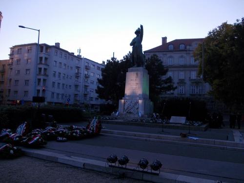 Az ünnepségsorozat 22-én délután kezdődött a Budapesti Műszaki és Gazdaságtudományi Egyetem aulájában, innen indult a Bem térig haladó fáklyás felvonulás. Mi sokakkal együtt a Bem téren vártuk a menetet, amely, bár jó fél órával a meghirdetett öt óra után, de a közelben megkonduló harangok szavára megérkezett, és elkezdődött a megemlékezés az ünnepi díszbe öltöztetett téren. A virágokkal körbeültetett Duna-parti zöld területet koszorúk halma tarkította, Bem József szobrát két oldalról piros és zöld színnel világították ki. A szobor mellett a Székesfehérvári Gimnázium kórusa állt, a Himnuszt velük közösen énekelték el a résztvevők.