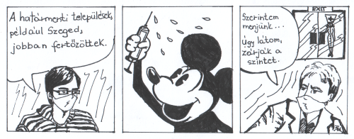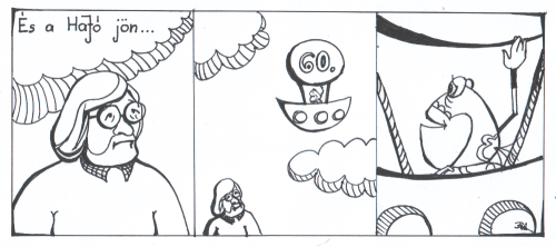 És valóban, a nyitvatartási időt betartva négykor az emeleti üvegajtók bezárultak, és a képregényesek közé tévedt illusztrátor munkáit is már csak az üvegfalon át lehetett fürkészni a lesötétített Internet-teremben. De az aulában még hatig égett a villany, mint a rajzolók keze alatt a munka, miközben igyekeztek teljesíteni a színházigazgató kérését, és papírra álmodták Pipás Pistát.