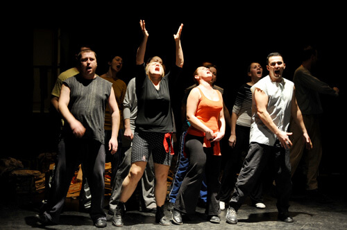 A budapesti felújító fotóspróbán az építésnek lehetünk tanúi: mint a katedrális falai, úgy emelkednek lassan és érnek össze a magasban a hangok, a karok, a mozdulatok. A háttérben óriási létrák kúsznak a Bárkává lett hajdani vívócsarnok teteje felé, egy égbeszökően magas elé egy alacsonyabb.