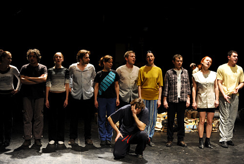 Feláll a kórus. Vidnyánszky Attila csendesen figyel, nem az őrjöngő rendező archetípusa ő. Javaslatokat tesz, kérdez. Itt most a rendezetlenség elrendezője, a káoszból lassan, megfontoltan kerül a helyére minden. Trill Zsolt teregeti a fehér lepedőket nagy gonddal a fürdőkádba, a redők, a hullámok finoman simulnak ki a keze alatt, fontos, hogy minden a helyén legyen. Ráncba szedi a fehér halmokat. Közben csendesen hadarja monológját, mintha csak magának mondaná, kíméli a hangját estére. De a halk szavú recitálás is megborzongat. Trill hangsúlyai, prózájának dallama úgy hullámzik, mint sebesen száguldó folyó árja. S akár a Cantata Profanában, Trill suttogó szavaira a kórus feldördül a háttérben, a mellkasunkban csattan a zene, a színpadon a cintányér. A zenét Vidnyánszky szerezte, de Bartók hangjai mélyen benne dörögnek a zenei és a prózai egységekben is.