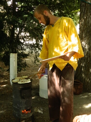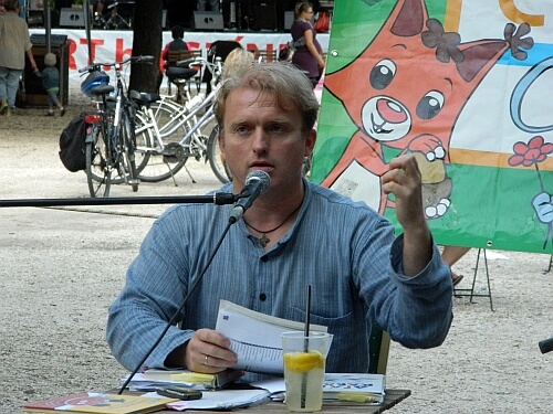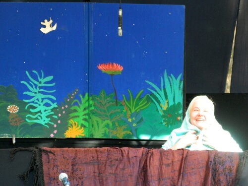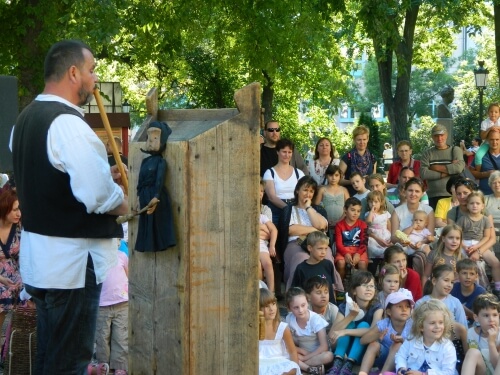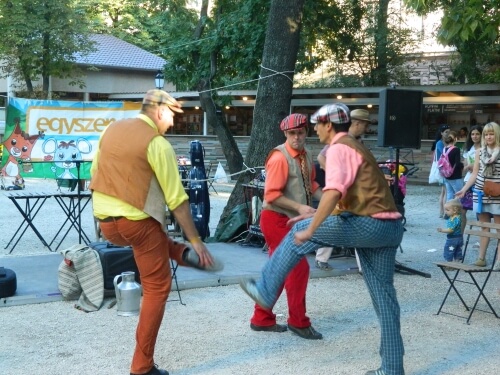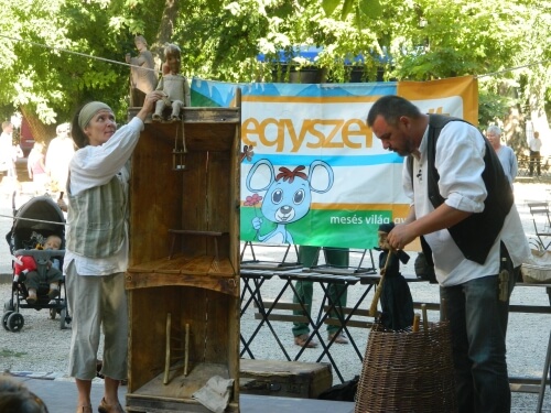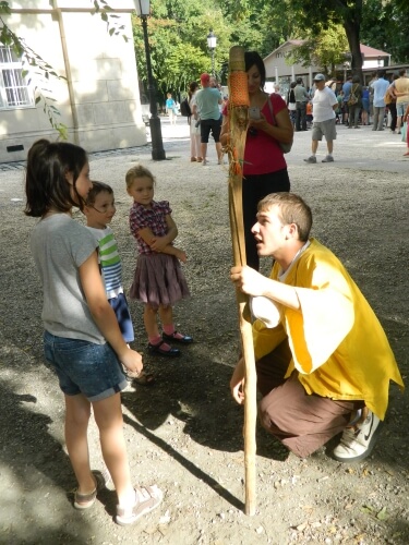 Míg a színháztermet berendezték Turek Miklós Radnóti-estjéhez, mi még visszaszaladtunk a Múzeumkertbe, ahol a Kaláka ugyan már épp véget ért, de a szórakozás korántsem. Itt épp a vándor mesemondót hallgatják a gyerekek, hogy a vers mellett a próza is helyet kapjon
