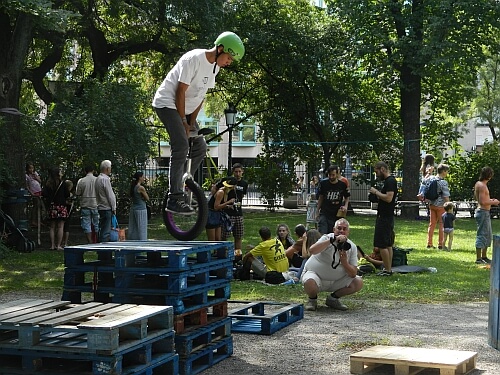 Mi azonban elindultunk a Kalákával egy időben kezdődő, közelben rendezett versszínházi estre, ám útközben muszáj volt megörökíteni a mesterien egykerekező srácokat, akik úgy ugráltak le-föl az egymásra pakolt raklapokra, mint a szöcskék