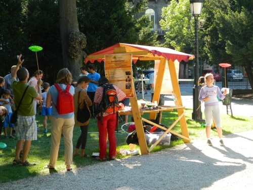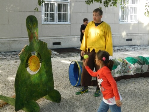 A délelőtt egészében a gyerekeké volt, akik rengeteg játékot kipróbálhattak. Ez itt a sárkányölők próbatétele: ahányszor eltalálták labdával a sárkány szívét, egy feje lehullott