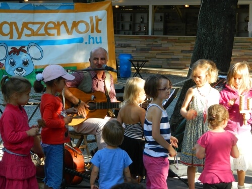 Az aprócska termetű közönség azonban erre fittyet hányt, és lelkesen zenéltek együtt Rozs Tamással a különféle ütős, kereplős, zörgős hangszereken.