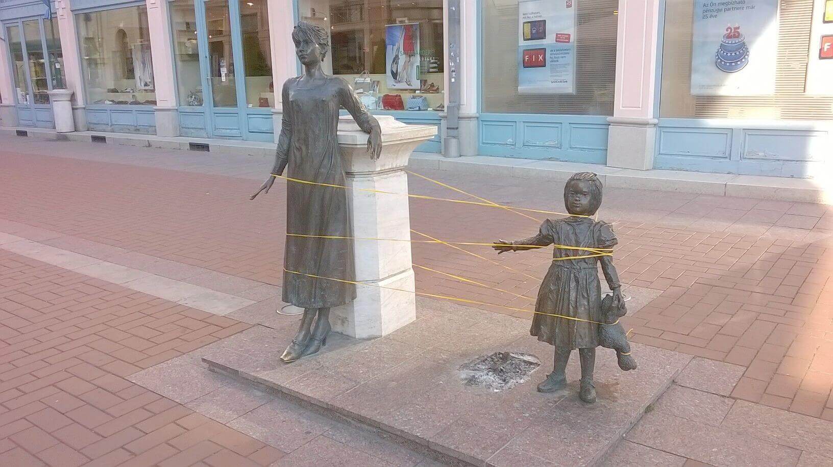 Az ország legszomorúbb szobra jelenleg Kligl Sándor megcsonkított alkotása a szegedi Kárász utcán. A kompozíció eredetileg négy részből állt: egy nőből, egy kutyából, egy gyermekből, akik egy hegedülő utcazenészt néztek. A képünkön látható kislány kutyáját azonban megrongálták, kidöntötték a helyéről, így a gyermek és az anya között tátongó hiány, a simogatásra emelt kéz melletti üresség, a talapzatból kitépett szobor helye sokkoló látványt nyújt. A megrongált szoborcsoportot sárga szalaggal tekerték körbe, jelezve, hogy a helyreállítás folyamatban van. A járókelők azonban néhány óra alatt ettől is megszabadították anyát és gyermekét.