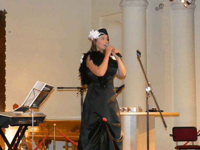 Csüllög Edina Karádi Katalinnak öltözve Karádi-dalokat adott elő. Néha még citerázott is