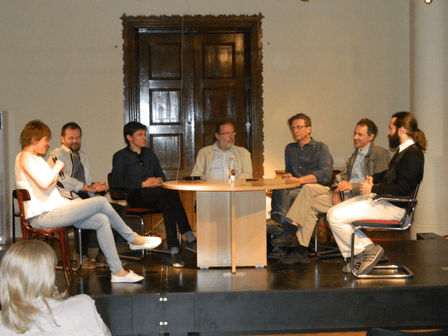 A díszteremben és a könyvtárban folyamatosan zajlottak a pódiumműsorok, itt épp a Magyar Építőművészet folyóirat tanácskozása