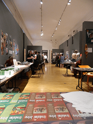 A folyóiratterem Irodalmi Jelen-perspektívából. A lapok számára fenntartott asztalok az egymásba nyíló szobákban kaptak helyet, kisebb labirintuson kellett végighaladni a látogatóknak, de ez senkit nem tartott vissza