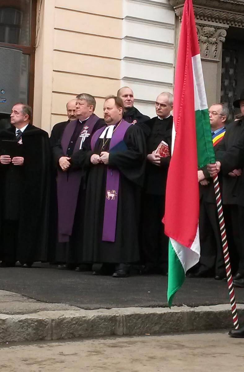 Délelőtt tizenegy és fél tizenkettő között a Protestáns Teológia Intézet előtt gyülekezetek az ünnepi felvonulásra érkezők, ezek a lobogók is a helyszínre "igyekeztek"