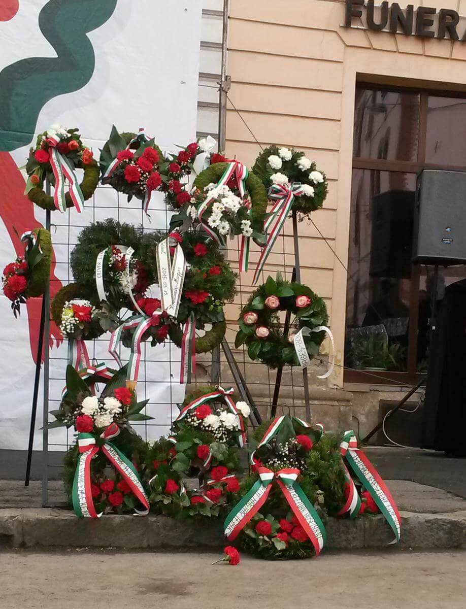 Koszorúk. Kevesebb van, mint egy székelyföldi megemlékezésen, de azért büszkék voltunk így is rájuk