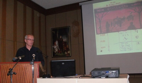 Kelemen Éva előadása, a kivetítőn Csáth Géza ifjúkori festménye