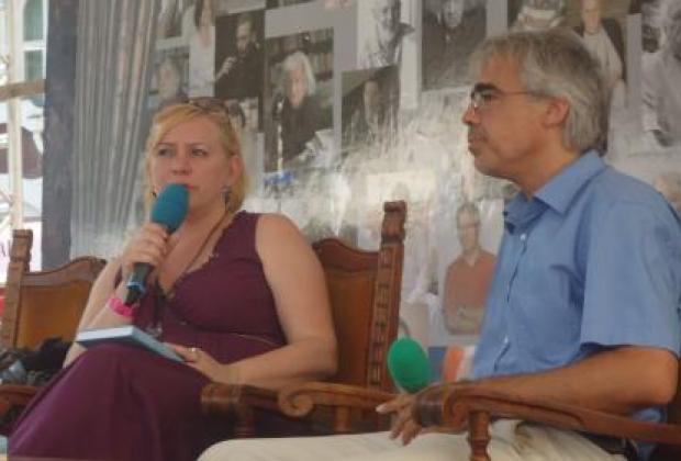 A könyvheti színpadon, az Oroszlános kútnál óráról-órára más írók, költők jelennek meg, hogy a moderátor kérdéseire meséljenek legújabb kötetükről, életükről, terveikről. Ungvári Tamás, Ferdinandy György, Magvető-antológiák és Udvariatlan szerelem – ízelítő a beszélgetésekből.