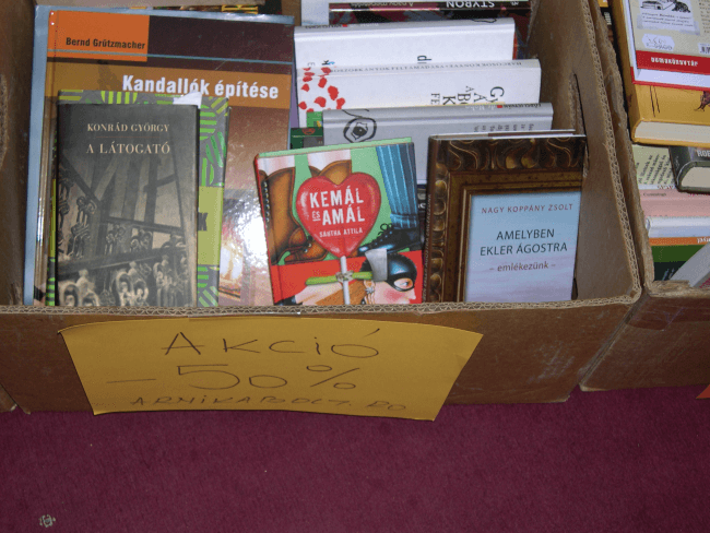 Az Árnika könyvesbolt akciója: Sátha Attila, Konrád György, Nagy Koppány Zsolt, György Attila féláron, ugyanitt Bartis Attila új regényét is be lehetett szerezni kedvező áron.