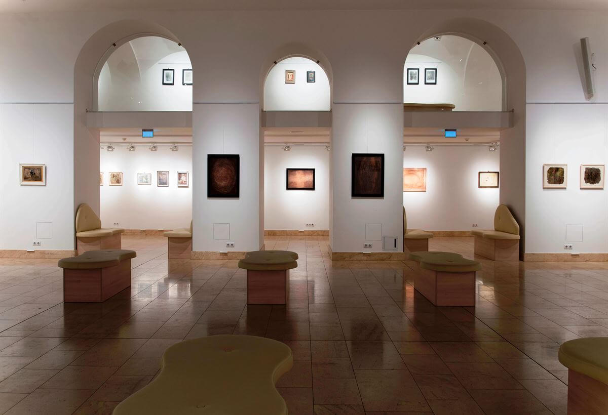 A földszinten régi képek sorakoznak, ismerősek, de sokadszorra látva is magukhoz vonzzák a néző tekintetét. Be-becsillan a kép az üveg miatt, fényképezni lehetetlen, a szem is hasonló a blendéhez, látja a becsillanó fényt. Szemszöget kell váltani, hogy előtűnjön a textúra és a faktúra. Az időtlenségbe vezetnek Bátai képei, legyen szó földírásról (Földírás I., II., 2009) vagy Afrikáról (Afrika I., II., III., 2009), egy számunkra ismeretlen világról. Mire földmíves lett az emberből, évezredek teltek el, megtanulta látni a földet, a változását. Nem véletlen, hogy a tavaszünnep a föld ünnepe is, a termékenységet szimbolizálva, a születést, a megújhodást. Bátai képei másként köszöntik a tavaszt, a színnel, a vörössel, a bronzzal, a nap égető hevével (Kezdet I–II.). Mintha nem az életet mutatná, hanem az élet utáni világot keresné és tárná elénk (Kőfejtő I., Lelet). A pusztulás képeit látjuk, és a földírásnál vesszük észre, itt vetésről van szó, a grafikák a földírást mutatják, a rendet, a sort, magát az évszakot, az áradás előtti világot. Kopócsy kollázsai is a múltba vezetnek, rejtelmekbe, az idő előtti világba (Kopócsy Judit: Kicsi fény, Elsüllyedt). Kopócsy képei világosak, mintha állandóan sütne a nap, télen is, éjszaka is. Ebbe a világosságba csempészi be fehér részleteit, állítja össze őket egy egésszé (Kopócsy Judit: Római élmény). Egységet mutatnak a részletek, semmi sem vész el belőlük, és semmi sem válik egyeduralkodóvá.