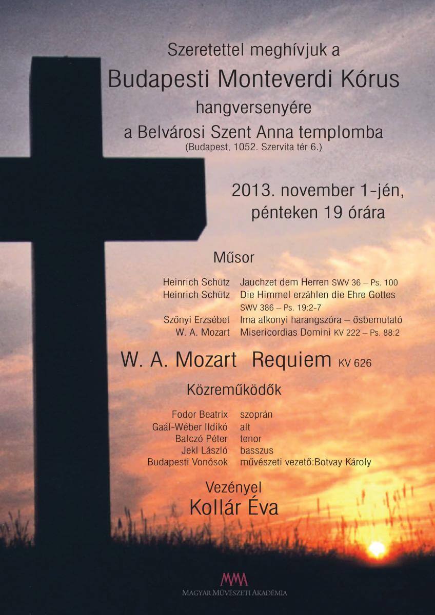 A Magyar Művészeti Akadémia a Belvárosi Szent Anna templomba várja az érdeklődőket 2013.november 1-jén a Kollár Éva vezette Budapesti Monteverdi kórus hangversenyére.