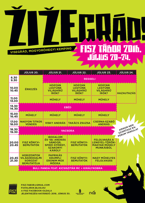 2016. július 20. és 24. között a Fiatal Írók Szövetsége ismét megrendezi nyári táborát Visegrádon. Az ötnapos irodalmi rendezvény ebben az évben is számos szakmai programot és újdonságot tartogat: Cserna-Szabó Andrással, Takács Zsuzsával és Visky Andrással, illetve egy meglepetés „sztárvendéggel” zajlanak a délutáni nagybeszélgetések. Napközben öt különböző műhelyben dolgozhatnak a jelentkezők, délutánonként és esténként pedig felolvasásokon, szakmai beszélgetéseken és társművészeti programokon vehetnek részt.