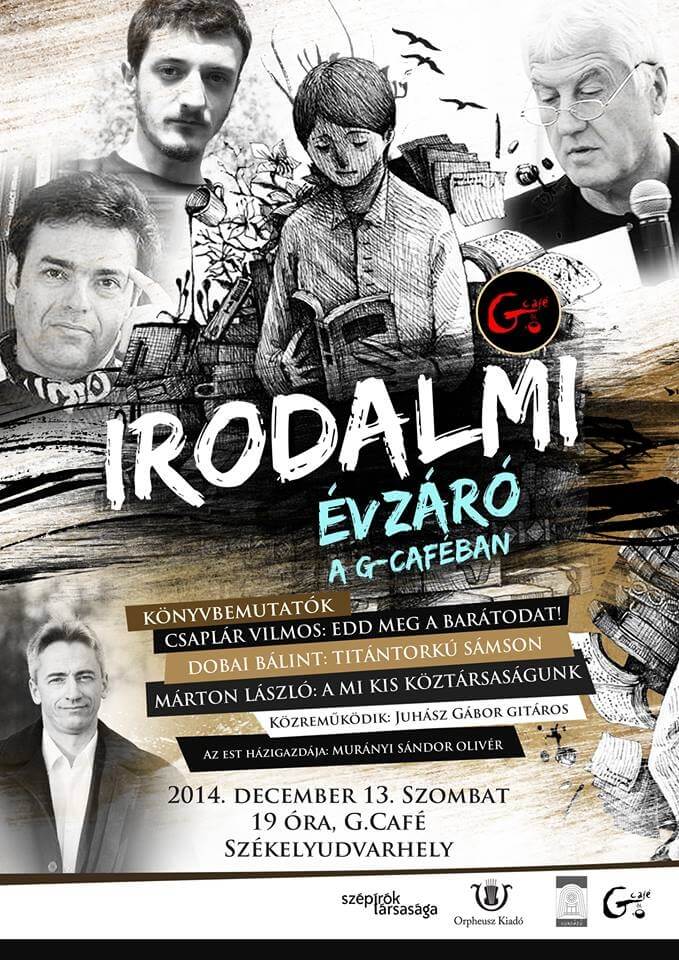 A szerzőkkel Murányi Sándor Olivér író beszélget december 13-án, szombaton 19 órától a székelyudvarhelyi G. Caféban. Közreműködik Juhász Gábor gitáros. A rendezvény támogatói a Szépírók Társasága, az Orpheus Kiadó, G. Kulturális Egyesület és a Gondűző Étterem és Szálloda. Mindenkit szeretettel várnak.