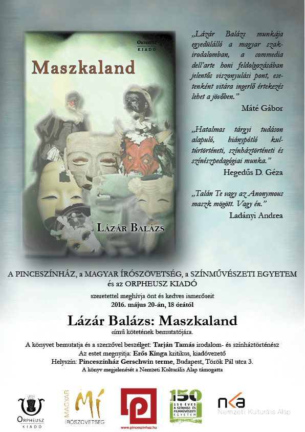Lázár Balázs Maszkaland című kötetét mutatják be május 20-án 18 órától a Pinceszínházban.