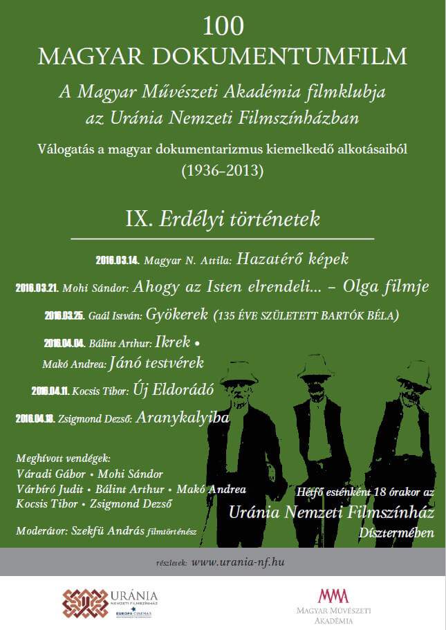 A Magyar Művészeti Akadémia 100 magyar dokumentumfilm vetítéssorozatának IX. filmblokkja Erdélyi történetek címmel 2016. március 14-én indult. A következő vetítés 2016. március 21-én 18:00 órakor